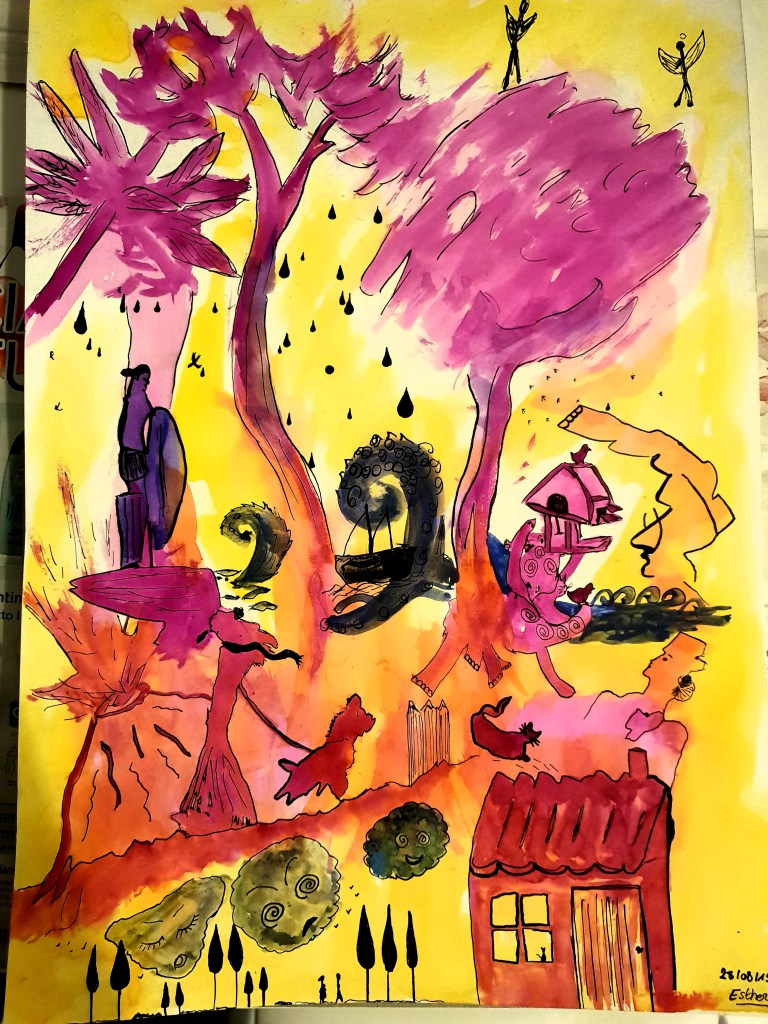 Nuage, le ballon de Stella, qui avait pour habitude de l’accompagner et de la guider, lui indiqua un chemin par lequel passer, où elle allait rencontrer de nombreuses figures des quatre saisons, l’hôtesse de l’air des avions du Printemps, le surfeur des vagues d’Eté, le Dali au chapeau éléphant d’Automne et la promeneuse d’Hiver. Nuage était ravi et ils marchèrent en direction des quatre saisons.