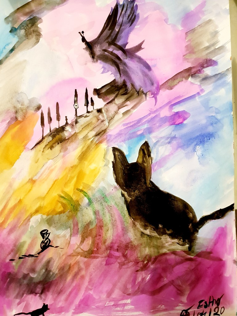 Nuage et Stella avaient vu toutes sortes de fleurs durant leur ballade. Chacune avec leur caractère! Certaines étaient douces aux couleurs pastelles bien huilées, d’autres plus sanguines et battantes malgré l’aquarelle, mais aussi quelques-unes, totalement égocentriques et superbement festives! Nuage s’était amusé et Stella n’en revenait toujours pas. Nuage, pour un ballon magique, avait vraiment de très bonnes idées de voyage. Aussi, quelques animaux allaient bientôt croiser leur chemin; un Paon orateur, un Cheval fou, une Oie pêcheuse, un Chat chasseur de papillons et un Perroquet musicien …