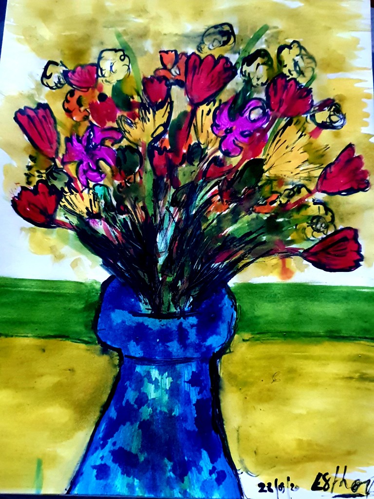 - 6-« Vase bleu Bouquet festif », Aquarelle Encre de Chine, 2020