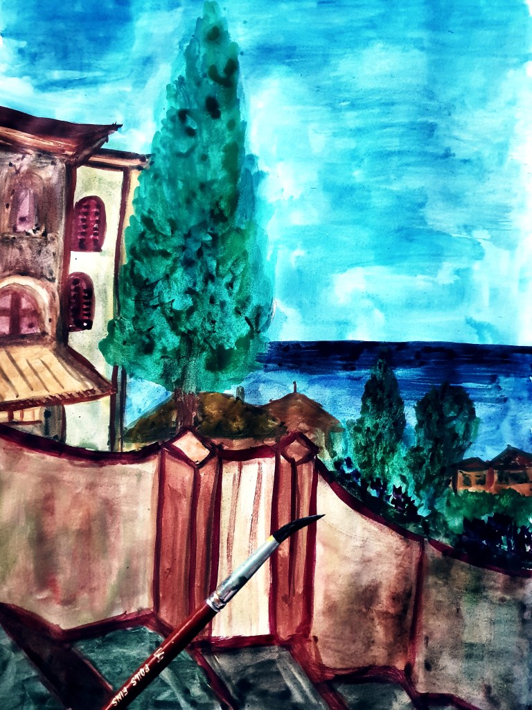 - 14-« Terrasse de Cap d’Ail », Aquarelle Encre de Chine,2020