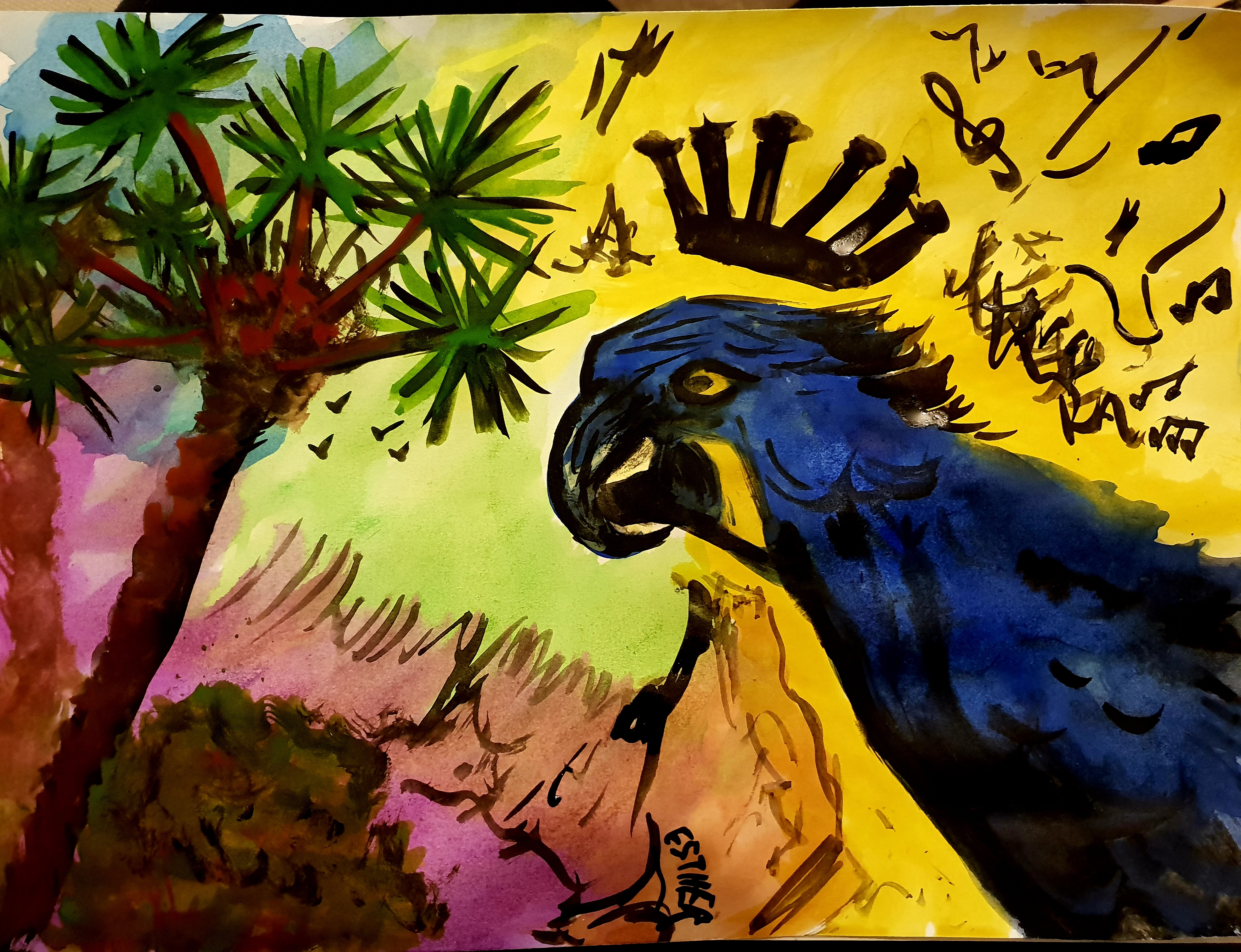- 13-« Ara musicien », Aquarelle Encre de Chine, 2020